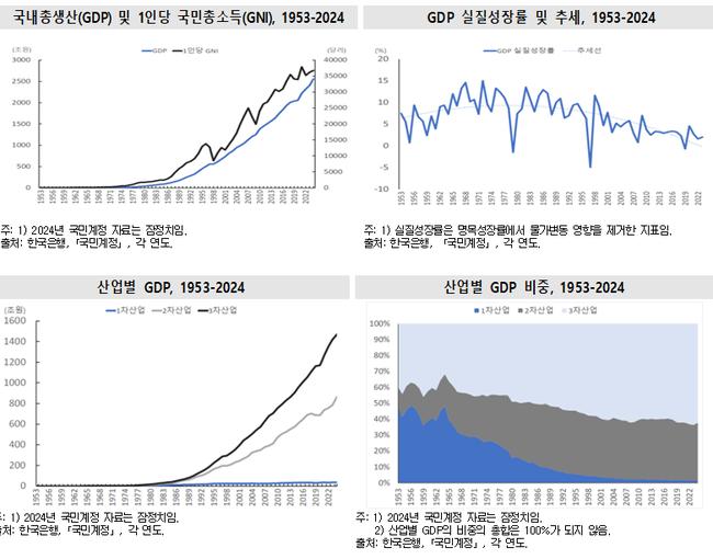 발표에 따르면 한국은 1953년 1인당 국민총소득(GNI) 67달러에서 2024년 약 3만6000달러로 도약하며 세계 10위권 경제대국에 진입했다. 1970~80년대 정부 주도의 경제개발계획과 중화학공업 육성으로 연평균 10% 내외 고도성장을 기록했으며, 외환위기(1997년)와 글로벌 금융위기(2008년)를 극복하고 반도체·자동차·IT 중심의 첨단산업 구조를 확립했다.