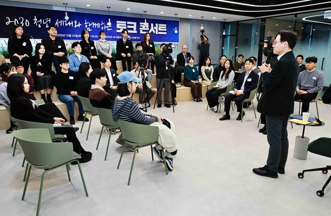 산업통상부는 12월 23일 서울 구로디지털단지 지타워에서 김정관 장관이 2030 청년 31명과 함께 ‘취업과 창업, 산업의 미래’를 주제로 토크콘서트를 열고 AI 시대 일자리와 산업 전망에 대한 청년들의 질문에 직접 답했다고 밝혔다.