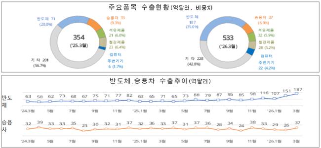 품목별로는 반도체가 압도적인 성장세를 주도했다. 반도체 수출은 163.9% 증가하며 187억 달러를 기록, 동기간 기준 역대 최대치를 경신했다. 전체 수출에서 차지하는 비중도 35.0%로 15.1%포인트 확대됐다. 이 밖에 컴퓨터 주변기기(269.4%), 석유제품(49.0%), 승용차(11.1%) 등 주요 품목이 고르게 증가한 반면, 선박은 3.9% 감소했다.