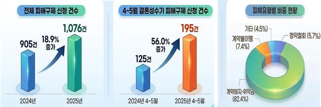 소비자원에 따르면 결혼서비스 관련 피해구제 신청은 2024년 905건에서 2025년 1,076건으로 18.9% 증가했으며, 특히 4~5월에는 전년 대비 56.0% 급증했다. 피해의 88.1%는 계약 해지, 위약금, 청약철회와 관련된 분쟁으로 나타났다.