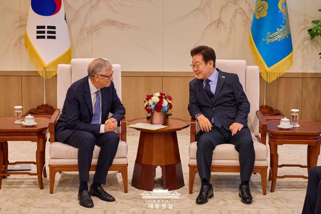 이재명 대통령이 빌 게이츠 게이츠재단 이사장을 접견하고, 보건, AI, 에너지 등 미래 핵심 의제에 대한 협력 방안을 논의했다.