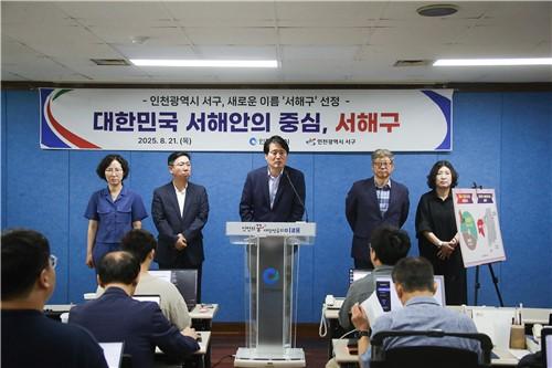 인천 서구(구청장 강범석)는 21일 목요일 인천시청 브리핑룸에서 기자회견을 열고, 행정 체제 개편에 따라 검단구와 분리되는 서구의 새로운 명칭으로 '서해구(西海區)'를 최종 선정했다고 공식 발표했다.