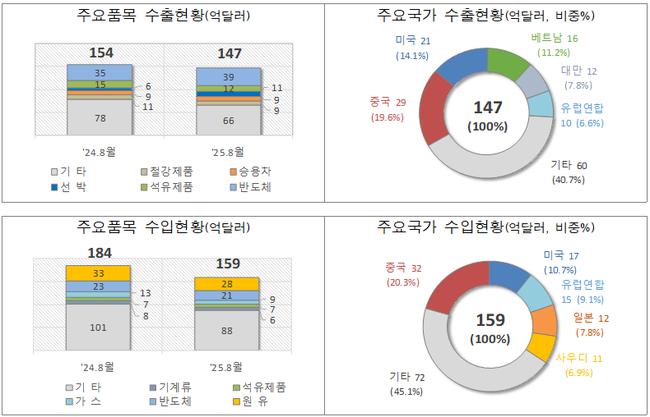 관세청은 11일 8월 초(1~10일) 수출입 실적을 발표했다. 올해 같은 기간 수출은 147억 달러로 지난해보다 6억6천만 달러(4.3%) 줄었으며, 수입은 159억 달러로 25억 달러(13.6%) 감소했다. 무역수지는 12억 달러 적자를 나타냈다. 조업일수를 고려한 일평균 수출액은 21억 달러로 전년 대비 9.3% 증가했다.