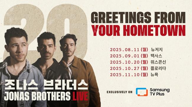 삼성 TV 플러스를 통해 세계적인 팝 밴드 조나스 브라더스(Jonas Brothers)의 데뷔 20주년 기념 콘서트 ‘JONAS 20: Greetings from Your Hometown’ 투어를 생중계로 볼 수 있다.