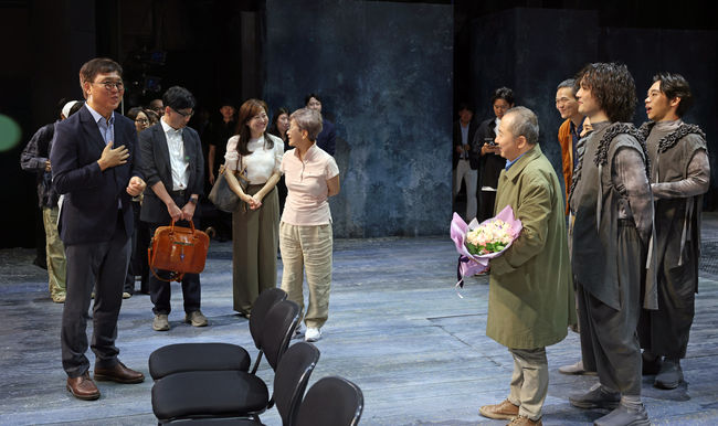 최휘영 문화체육관광부 장관이 3일 서울 중구 명동예술극장을 방문해 (재)국립극단의 ‘삼매경’ 종연 공연을 관람한 뒤 출연진을 격려하고 있다.