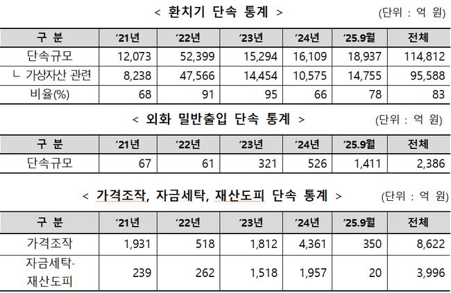 이번 특별단속은 △불법송금(환치기) △외화 밀반출입 △무역을 악용한 자금세탁 등 3대 유형을 중점 대상으로 한다. 관세청 집계에 따르면 지난 5년간 단속된 환치기 범죄 규모는 약 11조 원을 넘고, 이 가운데 가상자산이 사용된 비율은 83%에 달하는 등 익명성을 악용한 단속 회피 시도가 빈번한 상황이다. 관세청은 금융정보분석원(FIU)의 의심거래보고(STR) 등 위험 정보를 활용해 가상자산을 이용한 환치기 의심자를 집중 수사하는 한편, 환전영업자·소액송금업자 등 등록업자의 법적 범위를 넘는 불법 영업도 단속한다.
