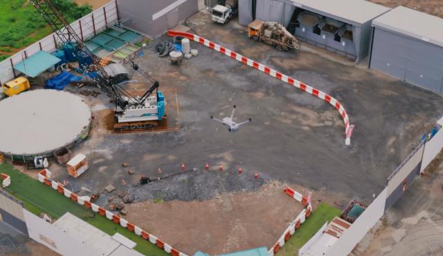 현장은 지상 도로와 지하 터널 공사가 동시에 진행되는 대규모 특수 현장으로, 복잡한 환경이지만 드론 스테이션에서 자동 충전, 이착륙하며 드론이 매일 현장을 촬영한다.