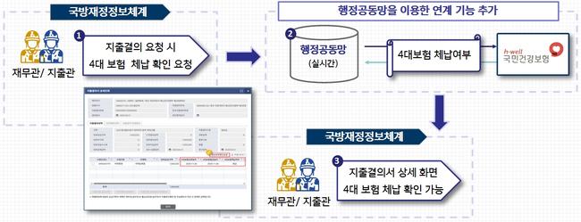 국방부는 2025년 12월 30일부터 계약대금 지급대상 민원인의 4대보험(건강‧고용‧산재보험, 국민연금) 완납증명을 행정정보공동이용망을 통해 자동 발급받는 서비스를 개시해 종이서류 제출 없이 계약대금을 받을 수 있게 했다고 밝혔다.