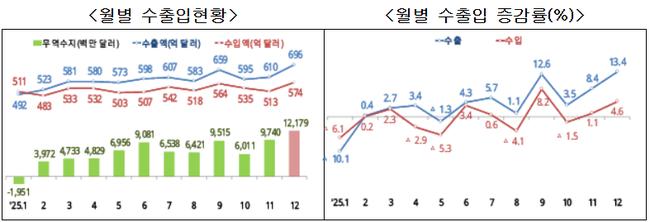 관세청에 따르면 2025년 12월 수출은 696억 달러로 전년 동기 대비 13.4% 증가했고, 수입은 574억 달러로 4.6% 늘었다. 이에 따라 12월 무역수지는 122억 달러 흑자를 기록했다. 조업일수를 고려한 일평균 수출액은 29.0억 달러로 전년 동월 대비 8.7% 증가했다.