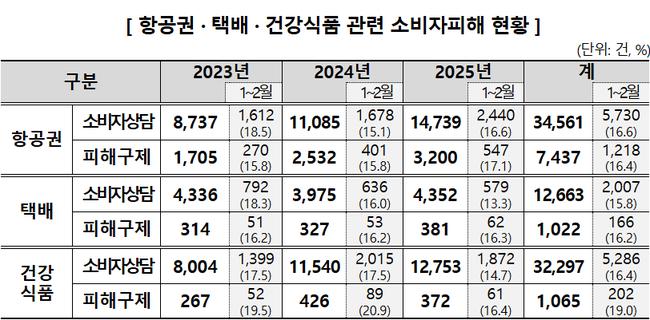 소비자원과 공정위에 따르면 설 연휴 전후 항공권, 택배, 건강식품 이용이 급증하면서 관련 피해가 반복적으로 발생하고 있다. 최근 3년간 설 연휴를 전후한 1~2월 접수된 피해구제 사건은 항공권 1,218건, 택배 166건, 건강식품 202건으로 전체의 16~19%를 차지했다. 특히 해외여행 수요 확대와 온라인 여행사 이용 증가로 항공권 관련 피해가 빠르게 늘고 있는 것으로 나타났다.