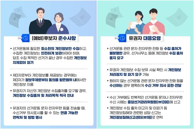 유권자 대응 방법도 함께 안내됐다. 개인정보 수집 출처를 명확히 밝히지 않거나 삭제 요청을 이행하지 않을 경우 한국인터넷진흥원 개인정보침해신고센터(☎118)에 신고할 수 있다. 또한 수신 거부 의사를 밝혔음에도 선거 메시지가 계속될 경우 중앙선거관리위원회(☎1390)에 신고가 가능하다.