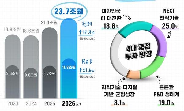 과학기술정보통신부가 2026년도 예산안을 발표하며 인공지능(AI)과 과학기술을 중심으로 한 혁신 성장에 역대 최대 규모인 23조 7000억 원을 투입한다.